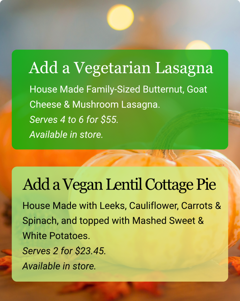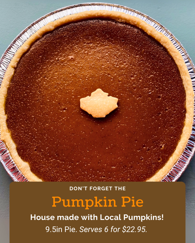Don’t forget to order our Vegan and Vegetarian options or a Pumpkin Pie or two, House Made with pumpkins from local farms!