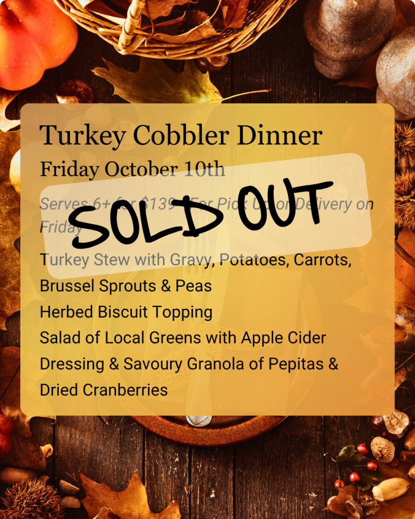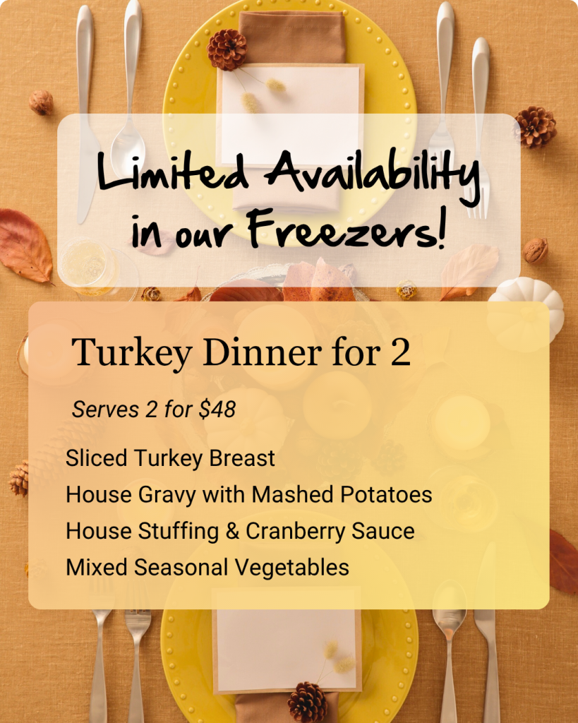 We have limited numbers of our Turkey Dinners for 2 available in our freezers while supplies last!